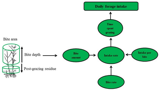 The daily forage intake capacity depends on the time spent grazing and the forage intake rate during this period. Thus, daily intake is a product of the number of bites per unit time (bite rate) and the amount of forage seized per bite (bite mass) (Hodgson, 1990) (Figure 1). However, seasonal variations, such as air temperature, relative humidity, rainfall, plant vegetative stages, and animal productive and reproductive stages, are factors that interfere with the daily forage intake. Different strategies are performed by animals seeking to increase their nutrient intake under grazing conditions (Newman, Parsons, & Penning, 1994). A decrease in the intake per bite causes a decline in the intake rate, unless there is a compensatory increase in bite rate (Hodgson, 1990). The intake per bite is influenced by the tensile strength of forage, so the bite mass may be limited by the maximum force that the animal is able to exert during the seizure of a bite.