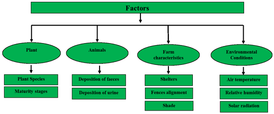 One of the most important traits in sheep and goats is their feed selectivity capacity. It is important to observe this characteristic in pasture management. According to the degree of selectivity, the animals will consume a pasture of higher or lower quality, which will influence their productive performance (Animut & Goetsch, 2008). Sheep and goats tend to be more selective than cattle, and young animals are more selective than older animals; however, diet selection patterns may be more unstable in young animals than in adults (Hodgson, 1990). Some authors (Poppi, Hughes, & L’Huillier, 1987, Sanon et al., 2007; Animut & Goetsch, 2008; Goetsch et al., 2010) suggested that the diet selection first involves feeding site selection and is then followed by bite selection. Thus, several factors influence the feeding site selection (Figure 2).