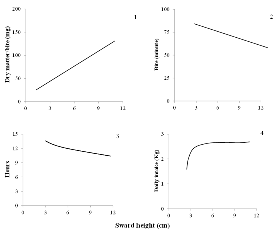 Some characteristics associated with the plant and related to harvesting by the animal are as follows: pasture height, forage mass per unit volume, leaf blade fibrousness, spatial arrangement of the preferred plant tissues, the presence of barriers to defoliation (such as sheaths and stems), and dry matter content. Usually, a higher sward height is related to a greater herbage mass, and a lower number of seizure movements is related to an increase in chewing activity (Penning, Parsons, Orr, & Treacher, 1991; Penning, Parsons, & Orr, 1994).