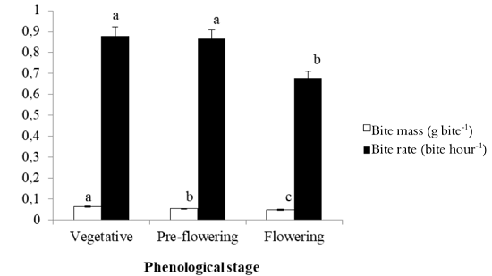 Forage intake by ruminants in pastures appears to be associated with the animals’ behavior. In situations with low forage supply, there is a decrease in bite weight and an increase in bite rate and/or time spent grazing (Penning et al., 1994). Forage intake by bite is very sensitive to structural variations, such as sward height (Silva et al., 2017). A decrease in bite weight promotes a decrease in the intake rate (Figure 3). Therefore, daily forage intake is also affected (Hodgson, 1990). Mass bite, which is influenced by sward structure, was the most important variable in determining forage intake by ruminants (Hodgson, 1985). Some other factors are also related to the bite mass, such as pasture height, blade spread (Flores, Laca, & Griggs, 1993), forage density of the grazing horizon, botanical composition, availability and accessibility of leaves (Hodgson, 1990), and the phenological stage of pastures (Stobbs, 1973; Goetsch et al., 2010). In an experiment conducted by Burlison, Hodgson and Illius (1991) to evaluate the ingestive behavior of sheep using different grasses with different heights, a positive correlation between bite mass and the sward height of higher grasses (>37 cm) was observed. However, there was no significant effect in grasses with heights ranging from 5.7 to 22.1 cm. Pedroso, Medeiros and Silva (2004), evaluating the bite rate and bite mass of ewes in different phenological stages of ryegrass pasture, verified average bite mass values of 0.064, 0.050, and 0.048 g bite-1 for the vegetative, pre-flowering, and flowering stages, respectively (Figure 4). For the bite rate, 0.88, 0.87, 0.68 bites h-1 for the vegetative, pre-flowering, and flowering stages were observed, respectively. These results indicated that the sheep presented a seletive behavior according to pasture age (maturity). The bite rate was negatively correlated with the bite mass, and the more forage taken, the more time was required to chew the bite. Similarly, an animal that consumes a higher amount of forage requires more time for rumination (Pedroso et al., 2004; Cardoso et al., 2019).