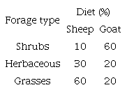 The intermediate behaviors of sheep and goats are related to their mouths’ anatomical adaptations, which allow this grazing characteristic. Goats, in an evolutionary-adaptive process, developed upper lips that enable them to pluck desirable leaves out from among thorns; however, whether or not this advantage is significant depends on the composition of available forage. The more uniform the forage, the less beneficial selective grazing is. Furthermore, if the plant quality in the maturity stage differs greatly, as in tropical pasture, the higher selection may impair an animals’ ability to survive in this type of environment. However, factors such as feed availability, thermal conditions, and plant preferences can affect the selection. Goats tolerate more bitter feeds than sheep and often consume browse plants in preference to grasses (Table 1) (Welch & Hooper, 1993; Moreno & Mitzi, 2008).