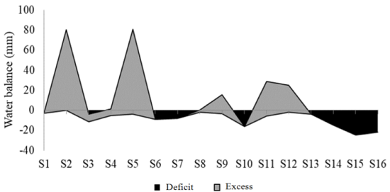 Average annual precipitation in the region is 1052 mm and the average accumulated annual potential evapotranspiration is 1472 mm. Average monthly temperature ranges between 24.7 and 26.9°C, with an annual mean of 25.5°C. The soil water balance (Figure 1) was calculated by the method described by Thornthwaite e Mather (1955), adopting a water-holding capacity of 25 mm. During the experimental period, an average temperature of 27.1°C (30.5 and 23.5°C, maximum and minimum temperature, respectively) was observed and a total precipitation of 394 mm.