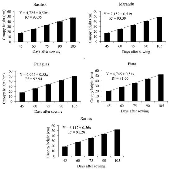 Canopy height fitted a linear regression model (p < 0.05), with estimated increments of 0.50, 0.53, 0.53, 0.54 and 0.56 cm for cvs Basilisk, Marandu, Paiaguás, Piatã and Xaraés, respectively (Figure 2). The response shown by those cultivars agrees with the period of establishment. Regardless of the evaluated cultivar, there was an increase in height as influenced by the time of full growth of the forage plant. In general, the recommended height at which the growth of Brachiaria should be interrupted is when the plants reach 25 to 35 cm (Silveira et al., 2013; Giacomini et al., 2009; Pedreira, Pedreira, & Silva, 2009). Therefore, based on those recommendations, 75 days after sowing would be the ideal moment to interrupt the growth process during establishment through harvest or lenient grazing.