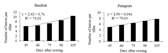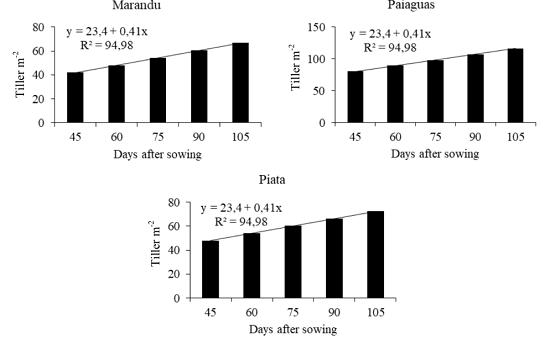 Tiller density in cvs Marandu, Paiaguás and Piatã fitted a linear regression model (p < 0.05). In each evaluation period, TD increased by 6.0, 9.0 and 6.0 tillers m-2 in the respective cultivars (Figure 4). In cvs Basilisk and Xaraés, this parameter was not influenced by the evaluated periods, demonstrating that the tiller population stabilized from the start of the evaluations to 45 days after sowing.