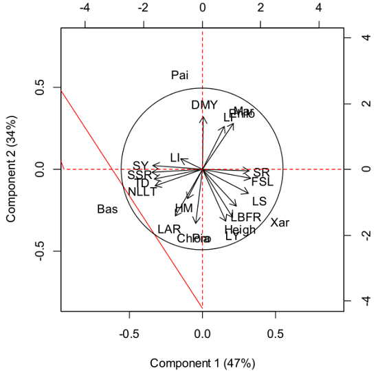 The first PC explained 47% of the total data variation and shows that, of the analyzed variables, FLL, LER and leaf blade percentage were positively correlated with each other and highly associated with cv. Xaraés (Figure 5). This indicates that higher LER were observed in cv. Xaraés because it is considered a taller cultivar, with longer leaves, among the Brachiaria cultivars (Silveira et al., 2010).