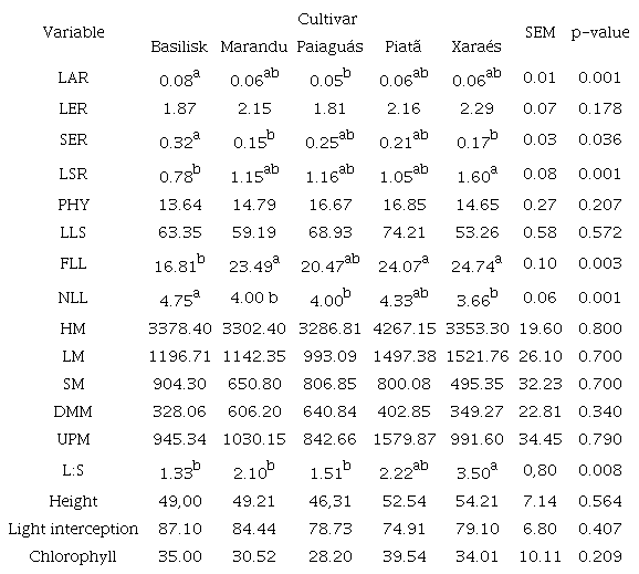 There was no cultivar effect for the masses of total herbage, leaf, stem, dead material and undesirable plants. However, cv. Xaraés showed a higher leaf:stem ratio than cvs Basilisk, Marandu and Paiaguás, while Piatã did not differ from the others (Table 2).