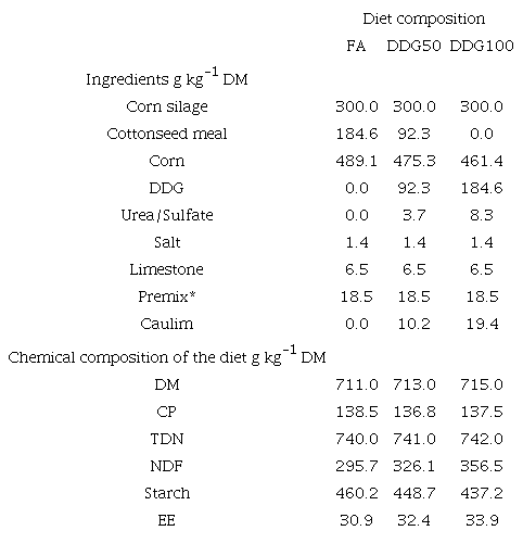 The inclusion of DDGs in the diet is an option that reduces feed-related costs if it does not alter animal performance (function of consumption and digestibility) (Griffin et al., 2012). Based on our results, the replacement of cottonseed meal by DDG was a viable alternative, as it did not interfere with the consumption of DM or nutrients and with the apparent digestibility of the nutrients. Moreover, DDG is a co-product that can be cost effective for the production system.