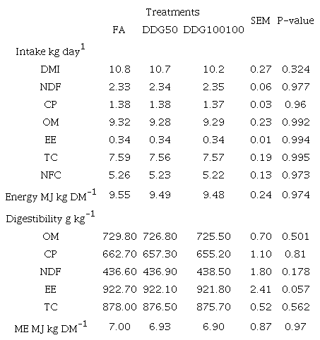 The productivity response of the animals depends on the consumption and the digestibility of the nutrients (Silva et al., 2009). In diets with high digestibility, the consumption may be lower, because when the food is more digestible the animal’s required energy intake will be satisfied by a lower feed intake, owing to the energy density of the diet (National Academies of Sciences, Engineering, and Medicine, 2016). In a study published by Walter, McAllister, Yang, Beauchemin, & McKinnon (2012), the authors reported that the use of corn DDG increased the CP and fiber digestibility; the latter increase was attributed to the low lignin content of the diet. This improvement is probably due to an increase in the ruminal fermentation power of DDG. DDG fiber is potentially more soluble and fermentable than other concentrated foods because it represents the portion of the cereal grain envelope (Association of Official Analytical Chemists [AOAC], 1990).