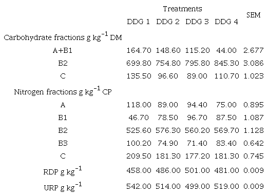 The A + B1 carbohydrate fractions correspond to the soluble fraction that consists of sugars that degrade rapidly in the rumen and to starch and pectin, respectively; fraction B2, which has a slower ruminal degradation rate, is the digestible portion of the cell wall, while fraction C is the indigestible portion of the cell wall (Sniffen et al., 1992).