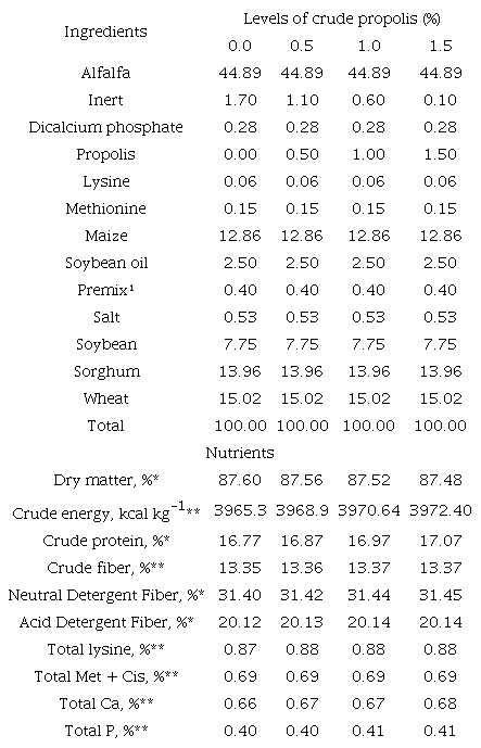 For the inclusion of propolis in the diets, the following procedures were performed: first, three kg of crude propolis were weighed and then frozen for eight hours. After this period, the propolis was ground in an industrial blender for one minute and sieved in a 15 x 32 mm mesh sieve, and incorporated into the feed in quantities related to the treatment levels. Subsequently, the feed was sent to the Nutrimax company, located in the Alfenas (state Minas Gerais, Brazil) Industrial District, where they were pelleted at a thickness of 4 mm and a length of 5 mm by the Chavantes press and pelletizer (model 125 CV).