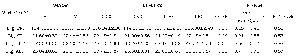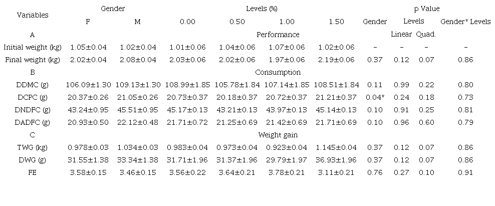 The variable final weight showed no statistical difference (p > 0.86) between the levels of propolis increased in the diets. The factor gender did not influence on the final animal weight, but showed a statistical difference when a higher consumption of crude protein was observed, when comparing males and females (p = 0.04; Table 2).
