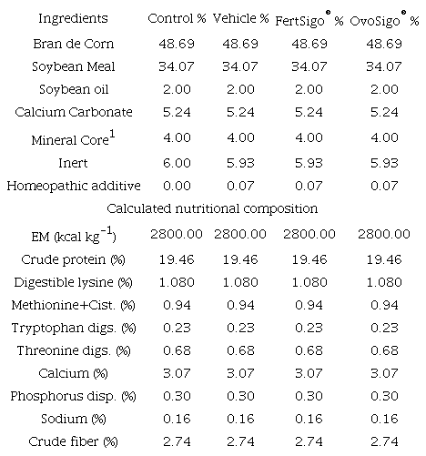 The diets used in the trial were formulated according to the requirements of Rostagno (2017; Table 1). The homeopathic products used were obtained from a commercial company and administered in the diets at a dose of 0.02 g ave-1 day-1.