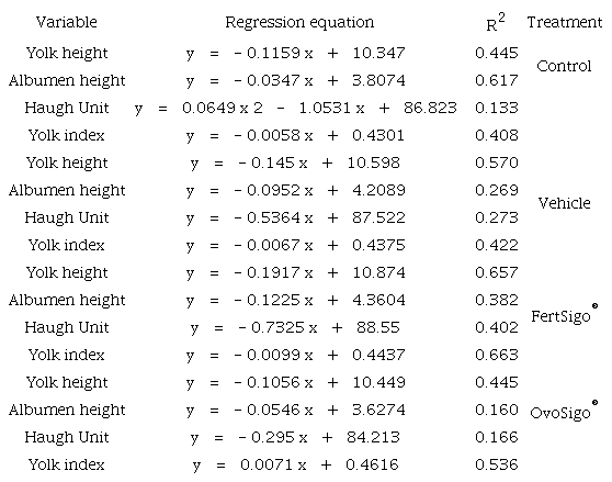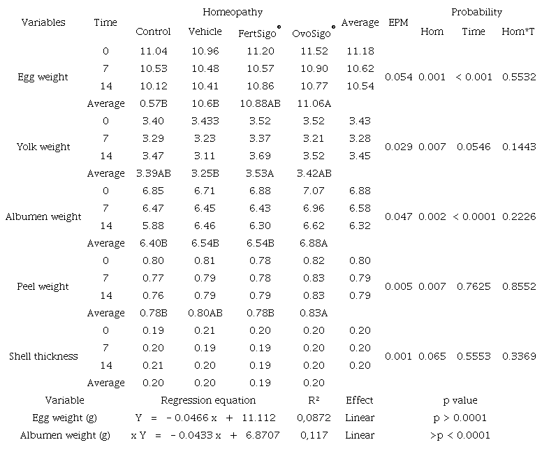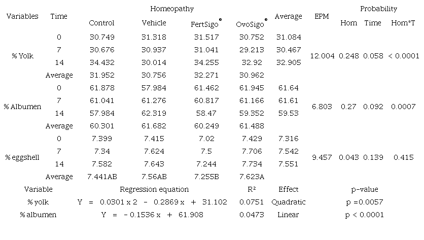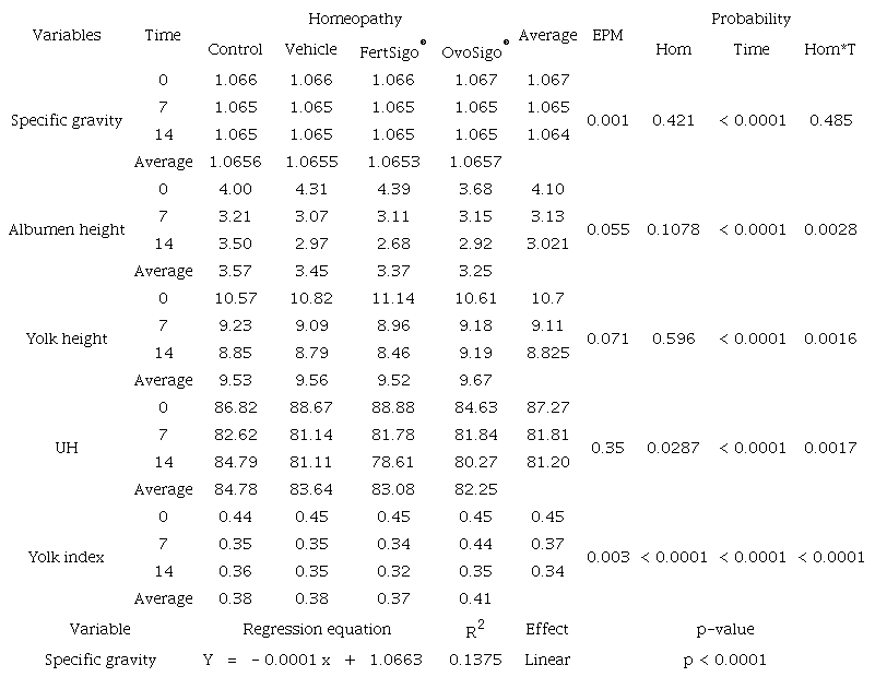 Regarding homeopathy and time interaction (Table 4) there was a significant effect (p < 0.05) for the variables albumen height, yolk height, Haugh unit, and yolk index according to the equations in Table 5. Time influenced the specific gravity (). R2: 0.1375).