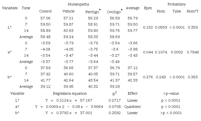 There was no significant interaction between homeopathy and time (p > 0.05) for the variables L*, a*, b*. An increasing linear effect was obtained for the incidence of L* (. R2: 0.2717) and b* (. R2: 0.2592) in isolation in relation to storage time. For the incidence of color, a* there was a quadratic effect (. R2: 0.0708) in relation to storage time (Table 6).