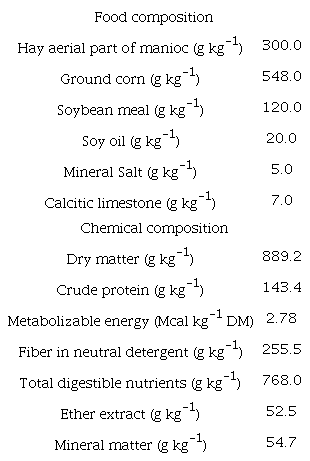 The experimental period was preceded of seven days for adaptation of the animals to the installations, feeding and management. As slaughter criteria, it was established the experimental period of 53 termination days. It was used a unique diet provided twice a day from 7 to 15 hours, which food and chemical composition are presented in Table 1. The diet was calculated to meet requirements for lamb with an average initial weight of 20.0 kg to gain 300 g animal-1 day-1, in accordance with the National Research Council [NRC] (2007).
