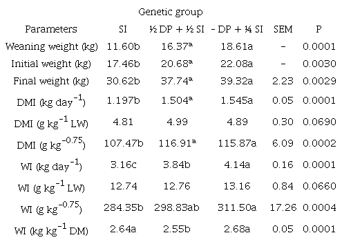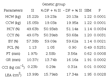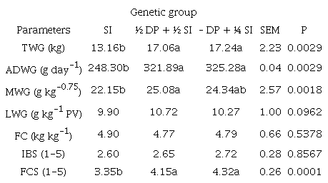 in that: Yij = value observed of the dependent variable studied; μ = general average; Gi = effect of genetic group i; Pj = effect of the initial weight covariate, and εij = aleatory mistake associated to each observation. The averages were compared by Tukey test at 5% of probability.
