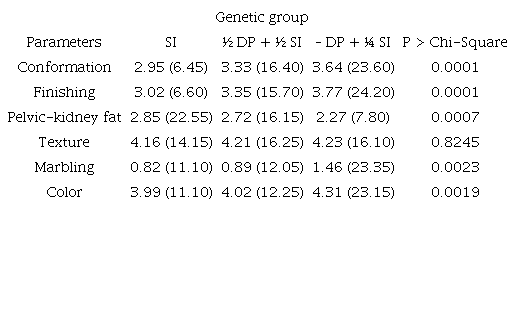 The carcasses – Dorper + ¼ Santa Inês lambs showed smaller (p < 0.05) Wilcoxon mean score to pelvic-kidney fat, suggesting smaller accumulation of internal fat, in relation to carcasses ½ Dorper + ½ Santa Inês and Santa Inês lambs. However, the carcasses of lambs with 75% of Dorper breed obtained higher values for marbling and meat color, important characteristics and which are related, respectively, with flavor and succulence of the meat, as well as the coloration of the meat. According Araújo Filho, Amorim, Monteiro, Fregadolli, and Ribeiro (2015) the marbling can be and important characteristic from the commercial point of view, increasing the quality of sheep meat.