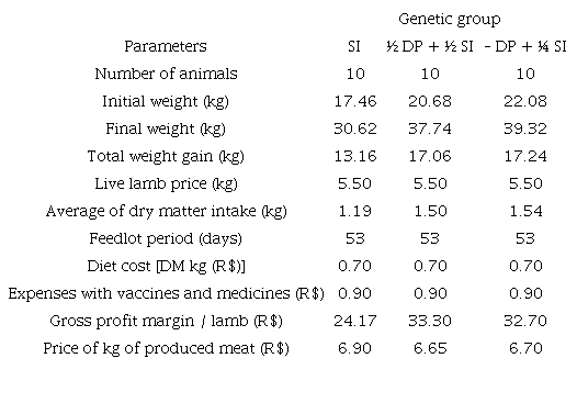 The impact of feedlot costs may vary according to the number of animals number of employees kind of installations and provided diet. Simulating the obtained results with the gross margin for a pattern producing system with 100 lambs, it would be generated in 53 days of feedlot an income of R$ 2,400.00 to Santa Inês, R$ 3,330.00 ½ Dorper + ½ Santa Inês and R$ 3,270.00 to – Dorper + ¼ Santa Inês. respectively.