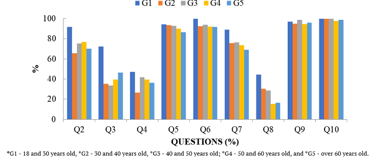 It was found that consumers answered “Yes” in all age groups (G1, G2, G3, G4, and G5) for questions 2, 5, 6, 7, 9, and 10 (Figure 1), demonstrating that most of the interviewees say they have knowledge about the way the animals they consume are raised, highlighting that the younger consumers, members of the G1 group (18 to 30 years old), had a higher rate of conviction, corroborating with Silva et al. (2020), who found that 60% of respondents have no knowledge of how production animals are raised.