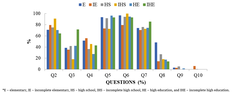 The research was carried out with the aid of a questionnaire with ten questions, with answers “Yes” or “No”, considering gender, age group (between 18 and 30 years old, 30 and 40 years old, 40 and 50 years old; 50 and 60 years old, and over 60 years old), education (incomplete elementary, elementary, incomplete high school, high school, incomplete and higher education) and family income (between 1 and 3 minimum wages - MW; 3 and 6 MW; 6 and 9 MW; 9 and 12 MW, and over 12 MW, whose interviewees were organized into six educational levels and five levels of family income. The questionnaire contained the questions described in Table 1.
