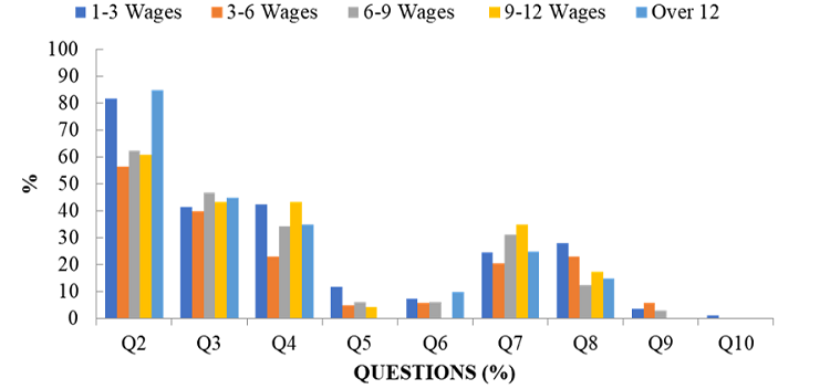 When assessing consumers' family income, a positive response was seen (Yes) from all respondents (1-3 MW - 81.9%, 3-6 MW - 56.6%, 6-9 MW - 62.5%, 9-12 MW - 60.9%, and above 12 MW - 85%) only in question 2 (Figure 3), where most of the interviewees reported having knowledge related to the way of raising the production animals that they consume, showing superiority in consumers with higher income to 12 MW, with 85% of positive responses. Similar results were found in Fortaleza, Ceará State, Brazil, where class A dominated, that is, with a family income exceeding 12 minimum wages (Queiroz et al. (2014).