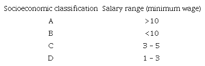 The interviews were conducted in two stores of a supermarket chain, in two different neighborhoods in the metropolitan region of Belém city, in Pará State, Brazil, in order to reach an audience of different socioeconomic levels. Socioeconomic classification was made, based on data from IBGE (2010) (Table 2), ordered according to the number of monthly minimum wages. Questionnaires were applied to different consumers of products of animal origin, in two supermarkets, one from each chain (chain 1 - C1 and chain 2 - C2), in a total of 401 individuals, chosen at random. Two supermarket chains were used to allow repetition among respondents of different income levels.