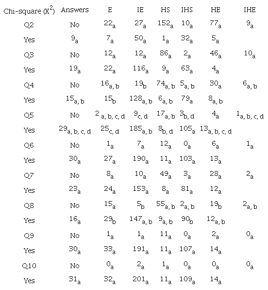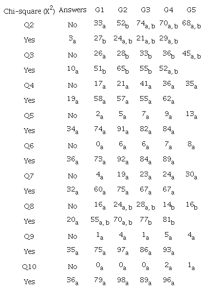 The answers obtained were analyzed individually, in percentage, using an Excel® 2014 electronic spreadsheet. For statistical analysis, the questions were grouped as follows: 1 and 2, 3 and 4, 5 and 6, 7 and 8, 9 and 10. The questions in pairs were analyzed with a non-parametric test of significance, using the chi-square (X2), as described by Levin (1987). The R program was used. The contingency matrix used contained two rows and two columns (2 x 2), with a degree of freedom equal to 1. The significance level was set at 5%, with a critical value of 3.84. The experiment hypothesis was considered accepted when it had a value equal to or greater than 3.84.