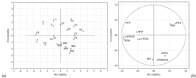 When analyzing the graph of dispersion of experimental diets between the first two principal components (Figure 1a), it is observed that diets C and CS tend to form a single group, with similar characteristics of fat quality and animal performance. However, the SFM and CC diets form isolated groups, with different fat and performance characteristics.