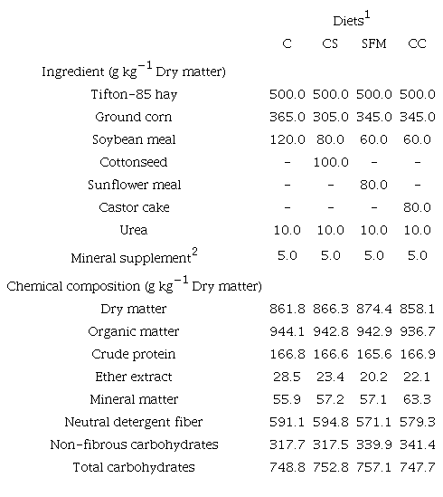 Experimental diets (Table 1) were formulated according to the Nutrient Requirements of Small Ruminants (National Research Council [NRC], 2007) for an average daily gain of 200 g. A conventional concentrate (control diet) was used, based on ground corn, soybean meal, urea, and mineral supplement, with partial substitution of soybean meal and corn with one of three agroindustrial co-products: cottonseed, sunflower meal, or detoxified castor cake with aqueous solution of calcium hydroxide [Ca(OH)2 1:10 (w/v)]. Diets were formulated to maintain protein and energy balance with a concentrate: voluminous ratio of 50:50 with hay made from Tifton-85 grass (Cynodon spp.).