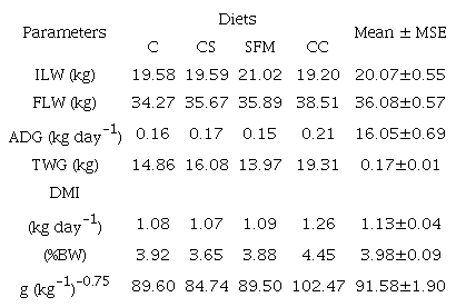 Diets were provided ad libitum, representing 4.5% of body weight as a complete blend. Animals were fed twice per day, in equal portions, at 7:00 am and 3:00 pm, admitting 20% of leftovers. The total quantity of feed supplied was adjusted daily, based on the amount of leftovers from the previous day to provide voluntary intake. A trial period of 106 days was established, with 14 days of adaptation to the experimental conditions (diet and management). Animals were identified and dewormed during the adaptation period. The dry matter consumption and performance data are presented in Table 2.