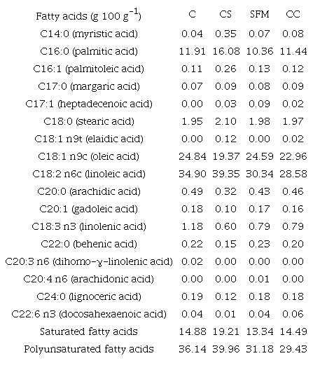 where: C18:2n6c = linoleic acid (g 100 g-1), C18:3n3 = linolenic acid (g 100 g-1), C14:0 = myristic acid (g 100 g-1), C16:0 = palmitic acid (g 100 g-1), C18:0 = stearic acid (g 100 g-1).