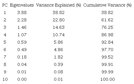 The Kaiser-Meyer-Olkin (KMO) and Bartlett's Sphericity tests were performed in the IBM SPSS statistical package, in order to verify the fit of the data to the Principal Component Analysis (PCA). The KMO value found was 0.52. According to Faria, Burnquist, and Pestana (2011), KMO values below 0.5 indicate that the use of factor analysis is inappropriate. Bartlett's sphericity test was significant at 1% (p < 0.000), rejecting the null hypothesis that the correlation matrix is an identity matrix. Thus, these results meet the assumptions of using Principal Component Analysis.