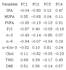 PC2, with 22.80% of the total variation of the data (Table 4), presented cholesterol (-0.82) and SFA (0.80) as predominant variables (Table 5). Such variables have a significant and directly proportional correlation (data not shown). Thus, PC2 can be interpreted as a negative index of meat fat quality, considering that the increase in blood cholesterol has been related to the consumption of saturated fatty acids (SFA) (Noto et al., 2016).