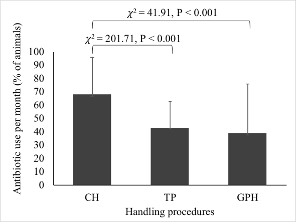 The fixed effects of handling procedures (CH, TP, and GPH) on the likelihoods of calf death were analysed using restricted maximum likelihood (REML). A logistic regression model with the probit link function (for an adjacent normal distribution) and with a binomial distribution of the response variables was applied by using the GENMOD procedure in SAS (SAS Institute Inc., Cary, NC), CH was set as the reference class. The Chi-Square test was used to compare the relative frequencies of antibiotic use between CH, TP, and GPH.