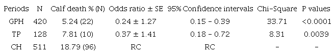 The mortality rate per month from birth to weaning was extremely high (18.79%) before the adoption of the good practices of handling (CH), reducing expressively after their adoption, dropping to 7.81% (58.4% reduction) during TP (when the good practices of handling was still being implemented) and to 5.24% when GPH were already implemented in the farm routine (72.1% reduction). The results of the statistical analysis sustained these reductions with high probability, showing that the risk of calf mortality was significantly lower (p < 0.005) after the adoption of good practices of handling (TP and GPH), when the odds ratio for calves death, which were reduced to less than half when compared to the value estimated in CH (reference class), as shown in Table 2.