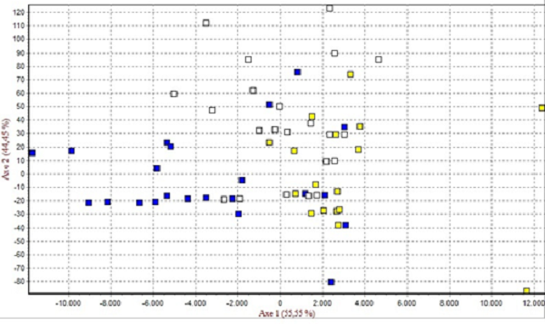 The factorial correspondence analysis (FCA) shows the distribution of genetic variability within a Cartesian plane (Figure 1), that is, it presents the distribution of genetic variability in spatial form. It is observed in the figure that there was no cluster formation (homogeneous and separate groups), but the overlap of several individuals of distinct populations, which indicates they are more genetically related, corroborating with the results obtained at AMOVA. These results are compatible with the dendrogram of genetic similarity (Figure 2), which, in general, there is no distance that shows a great genetic difference between stocks.