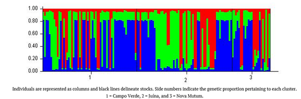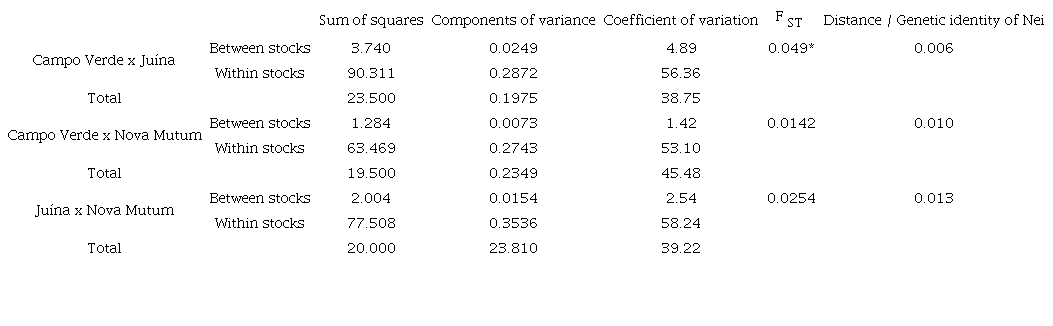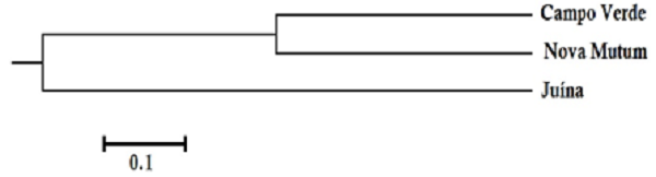 AMOVA (Table 3) indicated that the largest variation is within each stock for all combinations (53.36, 53.10, and 58.24% for Campo Verde x Juína, Campo Verde x Nova Mutum, and Juína x Nova Mutum, respectively). The fixation indices (Fst) ranged from 0.0142 to 0.049 (Table 3), demonstrating a small genetic differentiation (0.00 to 0.05) among the populations, according to Wright's (1978) definition. The genetic distance values showed high similarity among the three populations, which corroborated with the Fst values, since it showed slight differentiation (Table 3); also by the dendrogram (Figure 3) constructed from the genetic distance, which shows Campo Verde and Nova Mutum grouped in a first nodule at a distance of 0.003, with the inclusion of the three stocks in the second nodule at a distance of 0.006, indicating that there is low differentiation.