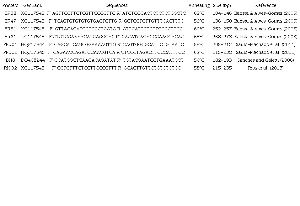 The amplification was performed for a final reaction volume of 15 μL, using 1X Tris-KCl buffer, 2.0 mM of MgCl2, 0.8 μM of each primer (forward and reverse), 4 mM of each dNTP, a Platinum Taq DNA polymerase and 20 ng DNA unit. Initially, the DNA was denatured at 94ºC for four minutes, and then 30 cycles of 30 seconds of denaturation at 94ºC were performed. Afterwards, the DNA was subjected to 30 seconds of annealing (variable temperature for each primer) and one minute of extension at 72ºC; Finally, a final extension was made at 72ºC for 10 minutes. In total, 49 loci microsatellites were evaluated in cross-amplification: five described by Sanches and Galleti Jr. (2006) for Brycon hilarii (Bh5, Bh6, Bh8, Bh13, and Bh16); eight described by Batista & Alves-Gomes (2006) for Brachyplatystoma rosseauxii (BR37, BR38, BR44, BR47, BR49, BR51, and BR61); nine described by Lee and Kocher (1996) for Oreochromis niloticus (UNH 104, UNH140, UNH 160, UNH169, UNH162, UNH190, UNH231, UNH159, and UNH163); four primers described by Calcagnotto, Russello, and DeSalle (2001) for Piaractus mesopotamicus (Pme2, Pme4, Pme5, and Pme28); ten described by Ríos et. al. (2013) for Rhamdia quelen (RHQ2, Rhq7, Rhq8, Rhq13, Rhq15, Rhq16, Rhq20, Rhq26, Rhq28, and Rhq29); two for Pseudoplatystoma punctifer (PPU01 and Ppu02), described by Saulo-Machado et al. (2011); two primers described by Santos, Hrbek, and Farias (2009) for Colossoma macropomum (Cm1A8 and Cm1A11); five described by Farias, Hrbek, Brinkmann, Sampaio, and Meyer (2003) for Arapaima gigas (CTm2, CTm5, CTm7, CTm13, and CTm15) and, finally, four primers described by Barbosa, Corrêa, Galzerani, Galetti, and Hatanaka (2006) for Prochilodus lineatus (Par12, Par14, Par15, and Par21). The primers that successfully amplified in the species Leiarius marmoratus, followed their respective repetitive units and annealing temperatures (ºC), as shown in Table 1. The reactions were performed in Veriti® ThermoCycler (Applied Biosystems®, Austin, TX, USA).
