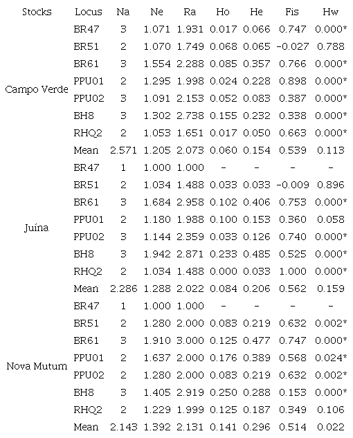 The expected heterozygosity ranged from 0.033 (RHQ2) to 0,477 (BR61), while the observed heterozygosity showed values of 0.000 (RHQ2) to 0.250 (BH8). The locus BH8 stood out in most of the evaluated parameters, being the most polymorphic among all the locus used. A deviation was observed in the Hard-Weinberg equilibrium (p > 0.05) in all analyzed locus, except for the locus BR51 in the stocks Campo Verde and Juína, locus RHQ2 in the stock Nova Mutum, and PPU01 in Juína.