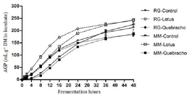 Additionally, the higher MB productions associated with the addition of CT suggest that the presence of these compounds in the rumen would produce an increase in the flow of microbial N to the duodenum (Nguyen, Wanapat, Phesatcha, & Kang, 2017), increasing the efficiency of recycled urea for the rumen due to a reduction on protein degradation, with a lower concentration of ruminal NH3-N (Nguyen et al., 2017). In this work, RG presented higher values of NH3-N (7.9 and 6.4 at 24 h and 8.9 and 11.7 at 48 h for RG and MM, SEM= 0.60, P < 0.05) and the highest concentration of NH3-N found after 48 h of fermentation in treatments with CT (9.2, 10.9 and 10.8, for Control, Lotus and Quebracho respectively, SEM= 0.73, P < 0.05) is consistent with the low MB production and suggests a lack of effect of the CT, at least partially, in the protection of protein against microbial attack.