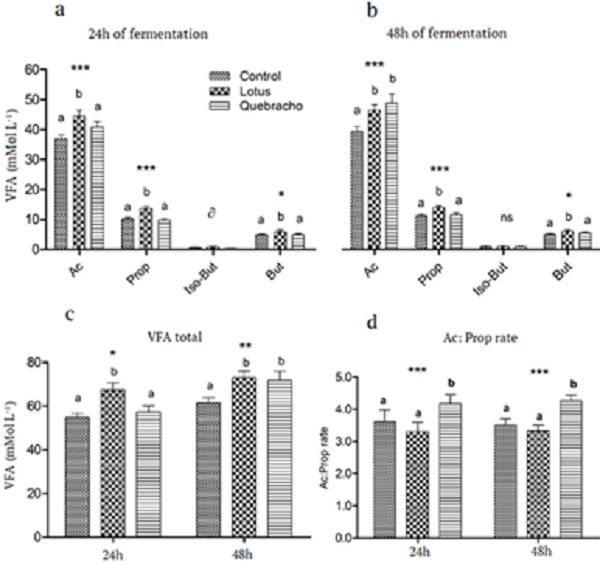 One of the mechanisms of action of CT in these populations may be linked to inhibitions of morphological changes of the cell wall (Jones, McAllister, Muir, & Cheng, 1994). Contrary to what was expected, in the present study both sources of CT increased CH4p compared to Control (P < 0.05, Table 2); however, no effect was observed with the addition of PEG (P > 0.05). These differences could arise in part, from dissimilar fermentation profiles, which would be defined stoichiometrically by the composition of the fermentation products (Blümmel et al., 1999), i.e. a higher concentration of VFA profiles. Lotus generated a higher concentration of acetic (Ac), propionic (Prop), butyric (But) acids, and total VFA (tVFA, 24 and 48 h, P < 0.05). On the other hand, the inclusion of Quebracho did not generate differences (P > 0.05) vs. Control at 24 h (Figure 2a and b). However, at 48 h, an increase in Ac led to greater tVFA (Figure 2c). Consequently, the Ac: Prop ratios of Lotus decreased while in Quebracho they increased (Figure 2d). These acetogenic profiles found with Quebracho treatment would release more H+ with methanogenic potential to the medium (Janssen, 2010).