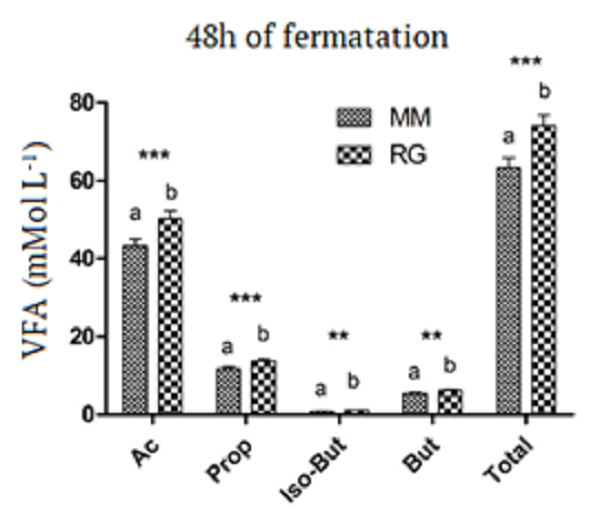 Moreover, the analysis of VFA showed differences for substrates only after 48 h of fermentation for all the VFA (RG > MM, P < 0.05, Figure 3), but without modifications in the Ac: Prop ratio (general mean= 3.7, P > 0.05). PEG did not produce any effect (24 and 48 h, P < 0.05, data not shown).