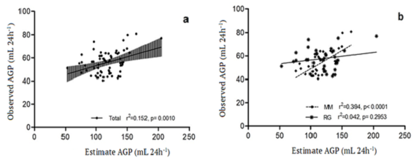 Analysis of products generated during in vitro fermentation provides valuable information of the ruminant feed under evaluation (Guyader et al., 2017). The stoichiometry developed by Wolin (1960) specifies that both the GP and its composition (i.e. CO2 and CH4) can be calculated from the proportions of Ac, Prop, and But obtained in vitro (Blümmel et al., 1999). While the production of Prop from pyruvate consumes hydrogen, the production of Ac and But releases CO2 and free H+ to the ruminal environment that escapes from the rumen mainly as CH4 (Janssen, 2010). This fact was confirmed by our results after 24 h of incubation as CH4-OMd decreased in association with Prop (-0.75 mL CH4 g-1 OMd, P = 0.31) and increased in concordance with Ac (0.22, P < 0.001) and But (0.77 mL CH4 g-1 OMd, SE= 0.729, P < 0.001) concentrations. Moreover, the comparison between the stoichiometrically calculated GP according to Blümmel et al. (1999) and measured, pressure-uncorrected gas volumes at 24h of total data were significant (slope 95% confidence interval of 0.065 to 0.244; P < 0.05), though the r2 coefficient accounted for just a 15% of total variation (Sy.x = 8,99, Figure 4a). This relation was greatly influenced by the MM AGP estimate (Figure 4b).