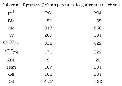 Leaves of RG and MM were harvested from the FAUBA experimental field, and fresh ground (i.e. once frozen with dry ice with a Foss Tecator 2096 Homogenizer mill; c.a. 1 mm particle size) and stored at -20°C until they were used. The DM of each substrate was assessed in an oven to ensure 0.250 ± 0.025 g DM within each bottle. These substrates were characterized (Table 1) by dry matter (DM, 105°C for 4h) and organic matter (OM, 550°C for 5h, Electric furnace, Q.R.L.® Argentina, Association of Official Analytical Chemists [AOAC], 1990, N°930.15), crude protein (CP = total N × 6.25, by Kjeldahl, Pro-Nitro® unit Selecta JP®, Barc., España, N°954.09), ash-free insoluble fiber in neutral detergent, with alpha-amylase (aNDFOM, Goering & Van Soest, 1970), ash-free insoluble fiber in acid detergent (ADFOM, N°973.18) and ash-free lignin content (ADL, N°974.17) with an ANKOM 200 Fiber Analyzer Unit (ANKOM® Techn. Corp., Macedon, NY, USA). The differences between aNDFOM and ADFOM and between ADFOM and ADL were used to estimate the hemicellulose and cellulose contents, respectively. The gross energy was determined using a Parr 1241® oxygen bomb calorimeter.