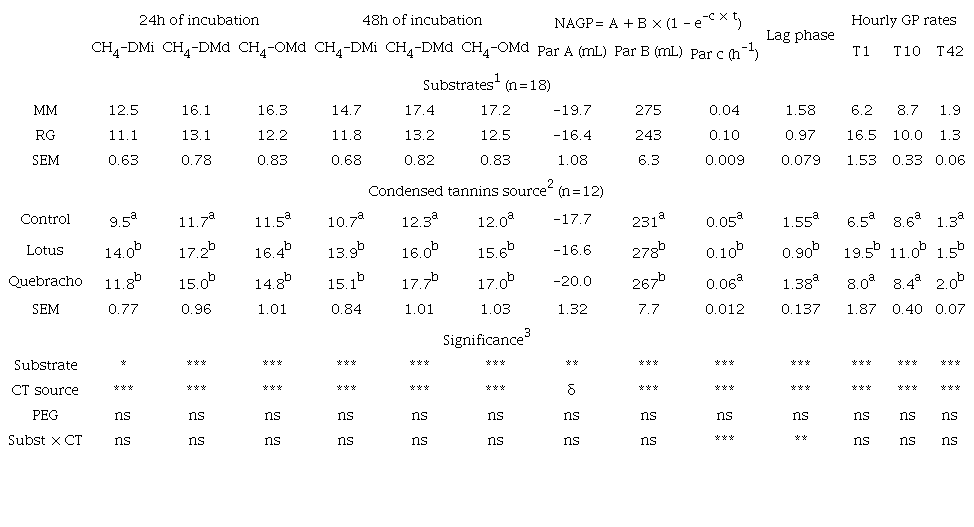 Non-linear models applied to in vitro gas production have been used for decades to predict the fermentation kinetics of ruminants’ feedstuff, and thus to analyze which proportion is fermented and which is used for microbial growth. In this experiment, the accumulated gas production (AGP, Figure 1) showed that none of the treatments completely achieved the asymptotic phase of gas production in 48 h, and this was particularly noticeable for MM. Parameter A (i.e. gas production from the immediately soluble fraction) differed between substrates (P < 0.05, Table 2), and RG showed a lower AGP from the insoluble fraction (Parameter B) and a faster rate constant for the insoluble fraction B (Parameter c) than MM. Hence, it is expected that when modeled, Par B had been overestimated especially for MM and consequently resulting in ‘B’ higher than the one for RG (P < 0.05). Moreover, RG presented a lower Lag phase (less than 1 hour, P < 0.05), and higher rates in the first hours (T1 and T10). However, after 42h, MM produced more gas (P < 0.05). These differences between RG and MM were coherent with the expected quality of these species. On the other hand, both extracts of CT presented higher Par B (P < 0.05), even when Lotus extract was added to MM, the lag phase decreased almost 50% compared to the Control (Control= 2.03, Lotus= 1.05, SEM= 0.156, P < 0.05, while in RG there were no differences, general mean= 0.97, P > 0.05, Table 2). Concomitantly, Lotus increased Par B and Par c, also agreeing with higher instant rates of GP during the first hours (100% at T1, and 27% more at T10), indicating differences among grasses in response to dietary CT inclusion. There was no effect with the addition of PEG (P > 0.05).