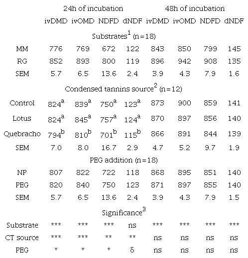 Three sources of CT extracts (i.e. Control [without CT], Quebracho [Schinopsis balansae] and Lotus corniculatus) were incubated with two substrates (i.e. ryegrass, Lolium perenne, RG and Megathyrsus maximus, MM) to evaluate effects of CT on in vitro fermentation parameters. Moreover, polyethylene glycol (PEG) was added to incubation (0 and 20 mg per bottle) due to its high affinity for CT, which allowed discriminating the specific action of CT present in the extracts. Briefly explained, sixty bottles (100 mL of capacity) were incubated per run accordingly: three sources of CT × two PEG levels × two substrates × two analytical replicates × two incubation times (24 and 48h), plus 8 blanks (i.e. 4 bottles × 2 incubation times) and 4 internal standards. There were three independent incubations (i.e. three different runs, statistical replicates, n= 3). The experiment was carried out in the Laboratory of Center for Research and Services in Animal Nutrition (CISNA), School of Agriculture of the University of Buenos Aires (FAUBA).