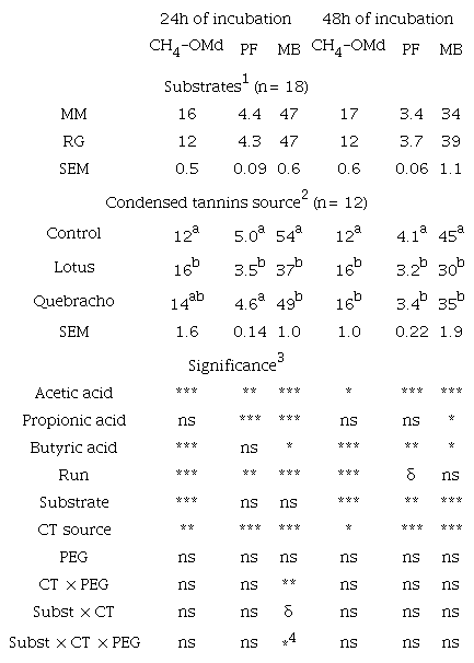 where, Yijklm= variable under study; αi= substrates (i= 2); βj= block (run, j= 3); γk= CT source (k= 3); δl= absence or presence of PEG (l= 2) and εijklm= experimental error. Interactions were evaluated and, when confirming that they were not significant, they were eliminated from the model. Three independent runs were carried out (i.e. Run≡ Block≡ Statistical replication) separated in time and with a mixed ruminal liquor from two different sheep each time. The variables were analyzed by ANOVA using the GLM procedure (SAS Statistics, Version 9.0. SAS Inst. Inc, Cary, NC, USA). Tukey test (to evaluate differences between substrates and interactions) or Dunnett test (to evaluate the effect of adding CT) with a level of significance P ˂ 0.05 were performed. Stoichiometrical relationships were examined by linear regression analysis using the statistical package GraphPad Prism® 5 (Version 5.01, GraphPad Software, Inc., USA). To account for the incidence of VFA concentration on variables associated with CH4p and MB an analysis was carried out seeing into experimental factors and VFA composition influence on CH4OMd, PF and MB.