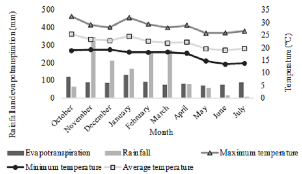 The experiment was conducted in the field under cutting conditions (without grazing) at the Experimental Farm Capim Branco, belonging to the Federal University of Uberlândia (UFU), Uberlândia, MG (18º53'19” S, 48º20'57” W and 863 meters altitude) from October 2014 to July 2015. The climate is tropical savanna (Aw, according to the Köppen classification), with well-defined dry and rainy seasons (Alvares, Stape, Sentelhas, Gonçalves, & Sparovek, 2013), with average annual temperature and precipitation of 22.3ºC and 1584 mm. Climatic data during the experimental period were obtained from a meteorological station located 200 m from the experimental area (Figure 1).