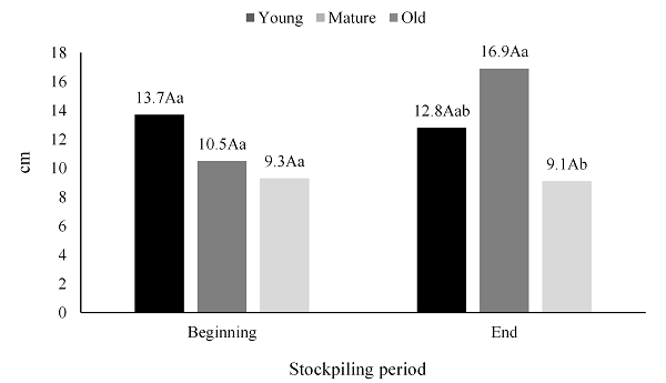 Old tillers occurred in greater numbers in the stockpiled canopy, when compared to young and mature ones (Table 2). When stockpiling pasture is adopted, the forage plant remains in free growth, and its development stage is not interrupted by grazing. Thus, the tillers reach older ages. In addition, if the stockpiling period is too long, there is less new tiller appearance and there is also a greater number of tiller dead in the canopy (Alves et al., 2019).