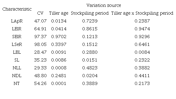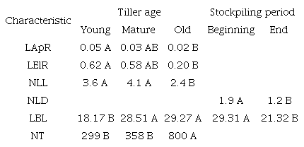 Of the nine response variables, 67% were influenced by the age of the tiller and approximately 20% by the stockpiling period. Only the final leaf blade length was influenced by the interaction between the stockpiling period and the tiller's age. On the other hand, some characteristics were not influenced by the studied factors, namely: stem elongation rate and leaf senescence rate (Table 1), which presented average values of 0.05 and 0.55 cm tiller-1 day-1, respectively.
